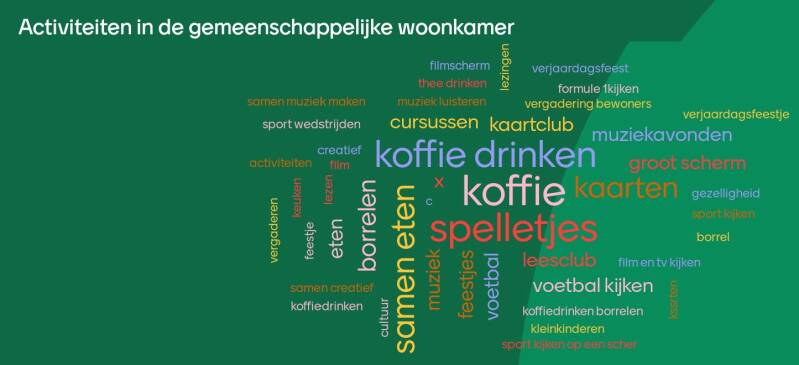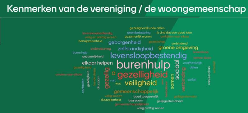 In de tweede bijeenkomst van de Woonco is een eerste aanzet gekregen voor een mogelijk visie. Op de vraag bij een digitale enquête naar de belangrijkste kenmerken van een woongemeenschap waren de meest gegeven antwoorden burenhulp, gezelligheid en veiligheid. En op de vraag wat de functie van de gemeenschappelijke ruimte zou moeten zijn scoorde buurtplein als hoogste. De deelnemers wilden daar graag koffiedrinken, spelletjes doen, samen eten en sport kijken op een groot scherm. Het belangrijkste voor het gehele project was het verkrijgen van een “levensbestendige woning en gemeenschappelijkheid”. Je zou mooie zinnen kunnen schrijven voor een visie, maar een visie moet gedragen worden, anders blijft het dood papier. We gaan hier 30 november verder over praten.